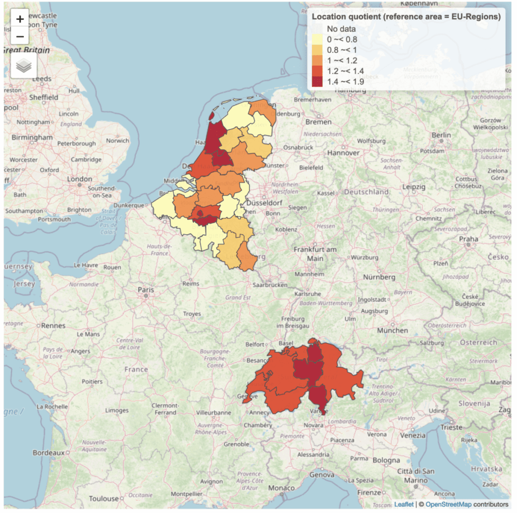 The treemap below shows how Switzerland’s 408’000 creative jobs are spread across different industries. The size of each box captures the number of creative occupations within an industry. The colour of each box shows the industry (NOGA1).